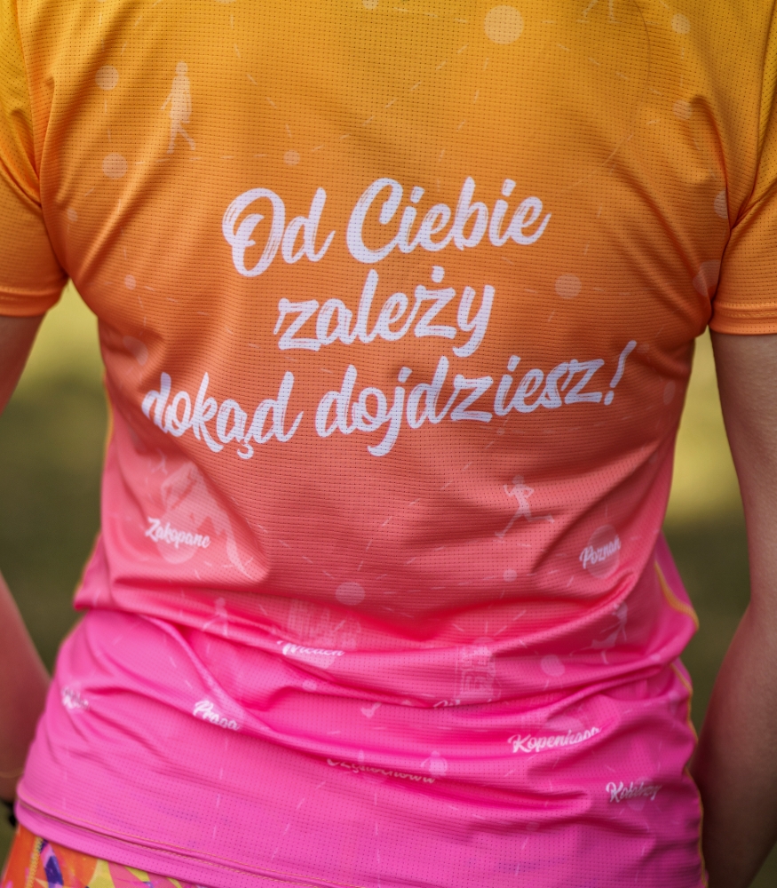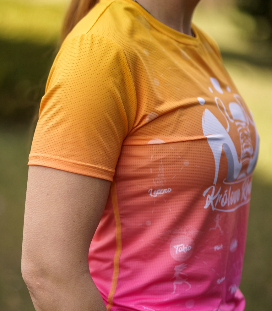 Damska koszulka techniczna Brzoskwinka to kolejna odsłona kolorystyczna kultowej koszulki “Królowa Kroków”. Efektowny gradient kolorów, przechodzący od żółtego u góry do intensywnego różu na dole doda Ci mnóstwo energii nie tylko podczas treningu. To koszulka którą będziesz chciał mieć zawsze na sobie.