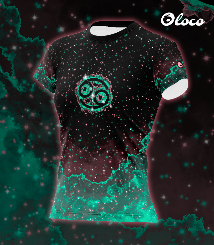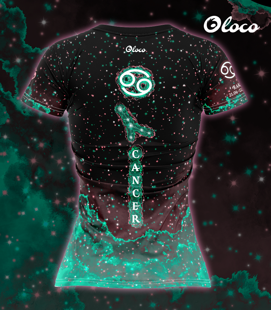 Koszulka wyróżnia się unikatowym, kosmicznym motywem z symbolem Raka umieszczonym centralnie na tle przypominającym rozświetlone gwiazdy. Dominujące kolory – biały oraz turkusowo-zielony – oddają emocjonalną i intuicyjną naturę tego znaku. Biel symbolizuje wrażliwość, opiekuńczość i głębokie emocje. Turkusowo – zielone akcenty odwołują się do żywiołu wody, podkreślając harmonię, spokój i duchowość. Połączenie tych barw idealnie współgra z pozytywnymi cechami Raka tj. empatią, lojalnością, delikatnością i rodzinnym ciepłem. Całość tworzy estetyczną, lekko mistyczną kompozycję, która przyciąga wzrok i podkreśla wyjątkową energię użytkowniczki.