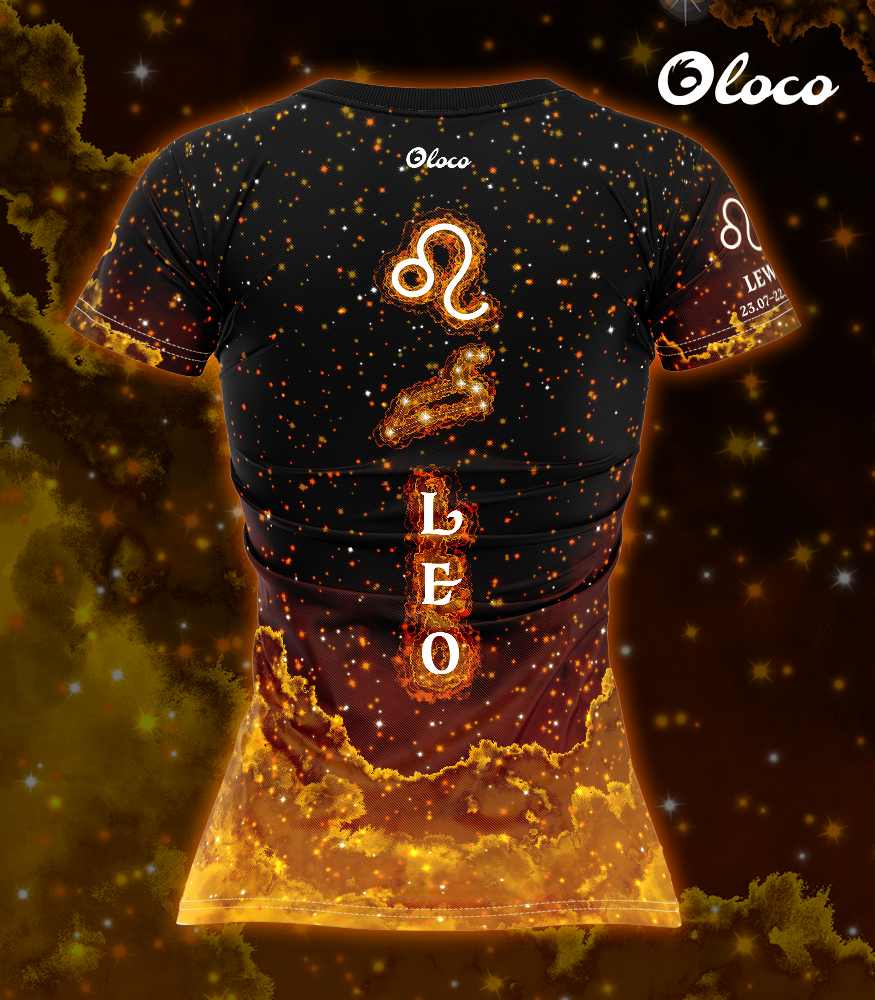 Design koszulki inspirowany jest gwiezdną energią Lwa – nasycony, dynamiczny i pełen blasku. Widoczny na froncie koszulki astrologiczny symbol otoczony jest świetlistym tłem przypominającym kosmiczną mgławicę. Dominują tu kolory złoty i pomarańczowy, które idealnie oddają charakter tego ognistego znaku. Złoto podkreśla pewność siebie, siłę, wrodzoną charyzmę i królewską naturę Lwa. Pomarańcz dodaje energii, witalności i twórczej iskry, która sprawia, że osoby spod tego znaku są tak inspirujące i odważne. Połączenie tych barw tworzy efektowny, żywy wzór, który nie tylko wygląda spektakularnie, ale również wyraża intensywną osobowość użytkowniczki.