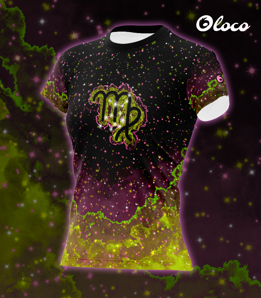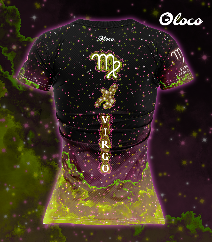 Koszulka damska treningowa wyróżnia się unikatowym, kosmicznym motywem z symbolem Panny umieszczonym centralnie na tle przypominającym rozświetlone gwiazdy. Naturalne kolory w połączeniu z pięknym nadrukiem znaku zodiaku tworzą harmonijną całość. Oliwkowy i brązowy akcentują praktyczność i pracowitość Panny, beżowy dodaje subtelnej lekkości, a różowy wprowadza delikatny, przyjazny akcent. Koszulka łączy w sobie sportową funkcjonalność z modnym, codziennym stylem.