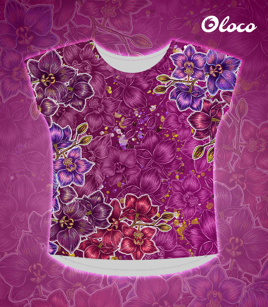 Luźna, zwiewna, wygodna i niezwykle kobieca, taka jest koszulka techniczna typu nietoperz w kultowym wzorze Orchidea.