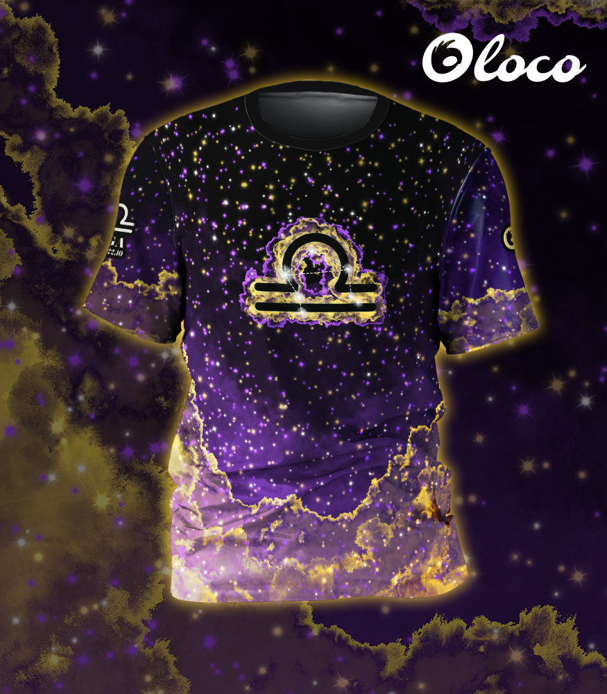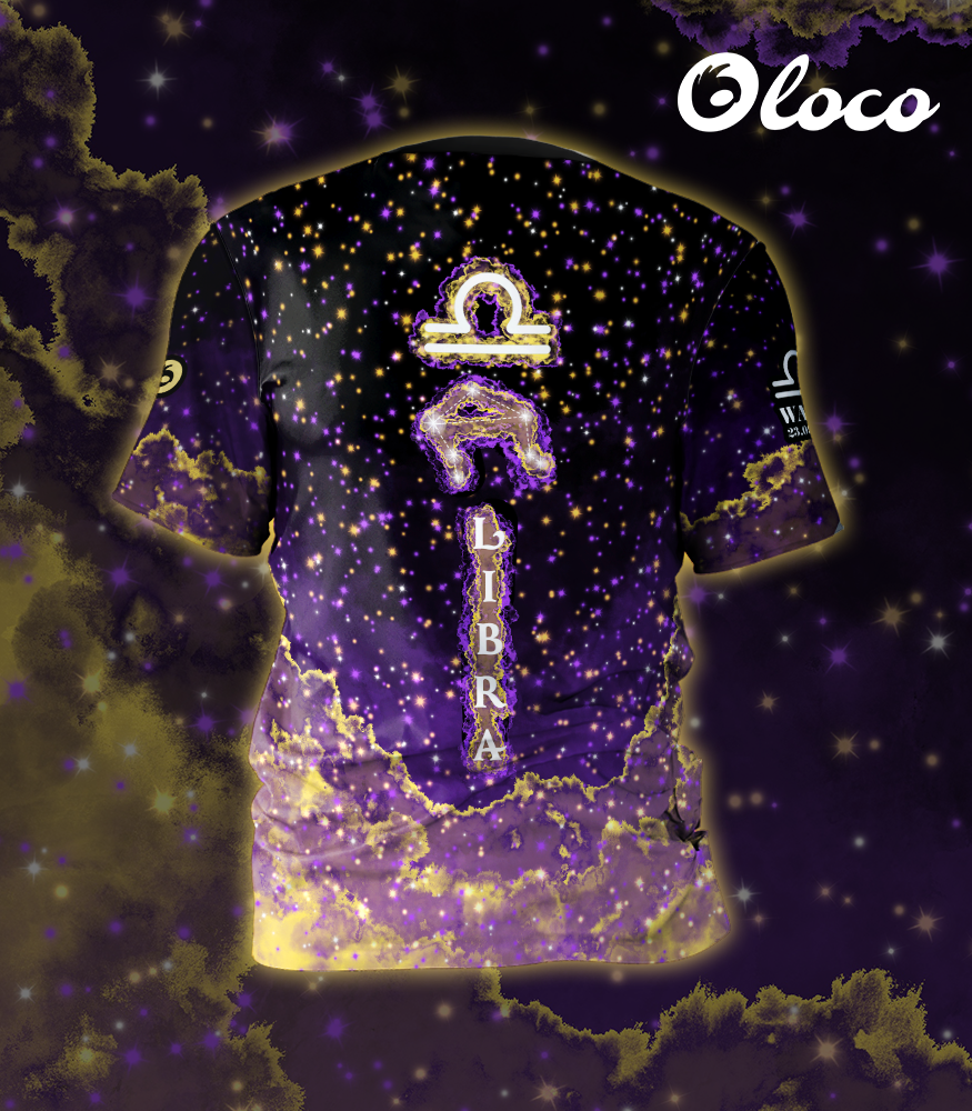 Koszulka Libra zachwyca kosmicznym, głęboko nasyconym motywem, w którym dominuje czerń tła, przełamana fioletowymi detalami i złotymi refleksami. Fiolet wprowadza poczucie równowagi i harmonii, a złoto dodaje elegancji i subtelnego blasku. Centralny, świetlisty symbol Wagi przyciąga wzrok i podkreśla charakter znaku – dążenie do sprawiedliwości, elegancję, wrażliwość i takt. Całość przypomina fragment nocnego nieba rozświetlonego gwiazdami i mgławicami, tworząc wyjątkowy, gwiezdny efekt. To koszulka, która łączy funkcję sportową z unikatowym, artystycznym stylem.