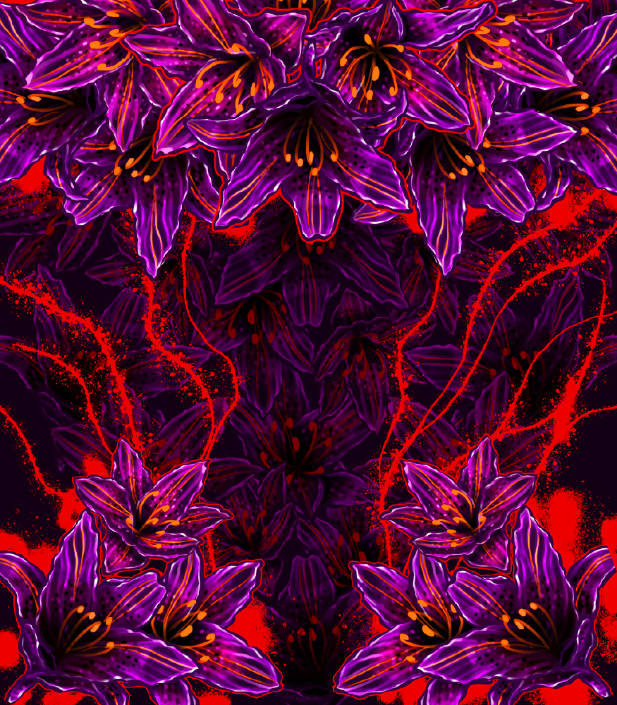Wzór tej spódniczki to prawdziwe połączenie tajemniczości i energii. Na głębokim, czarno - fioletowym tle rozkwitają majestatyczne lilie w odcieniach purpury, różu i fioletu. Dzięki warstwowym płatkom i delikatnym przejściom tonalnym motyw zyskuje niesamowitą głębię i trójwymiarowość. Charakteru całości dodają dynamiczne, karmazynowe smugi i rozpryski energii, które przecinają floralną kompozycję niczym artystyczne pociągnięcia pędzla. Kontrastujące, żółto - pomarańczowe pręciki w sercach kwiatów przyciągają wzrok i nadają projektowi nowoczesnego, nieco drapieżnego sznytu. To propozycja dla kobiet, które chcą czuć się elegancko, ale z wyraźnym, drapieżnym akcentem.