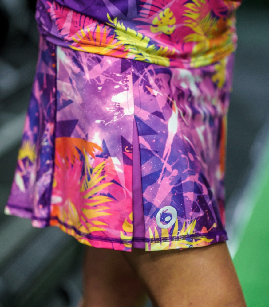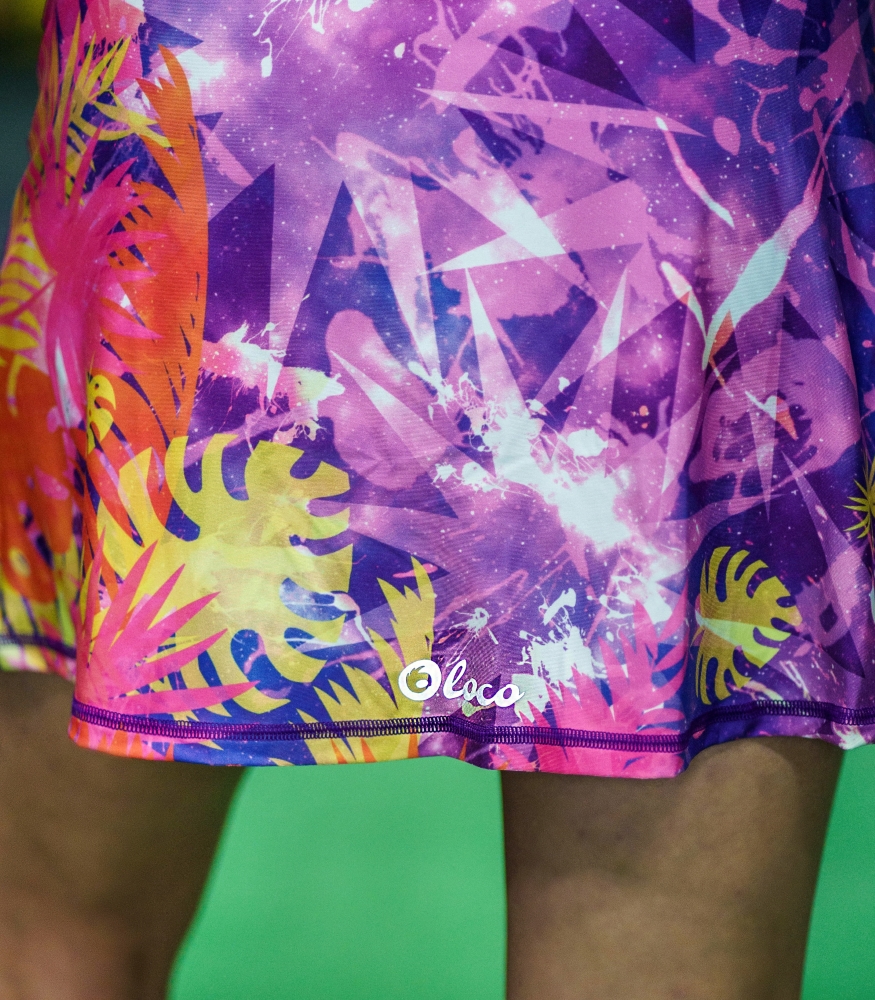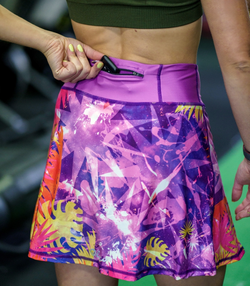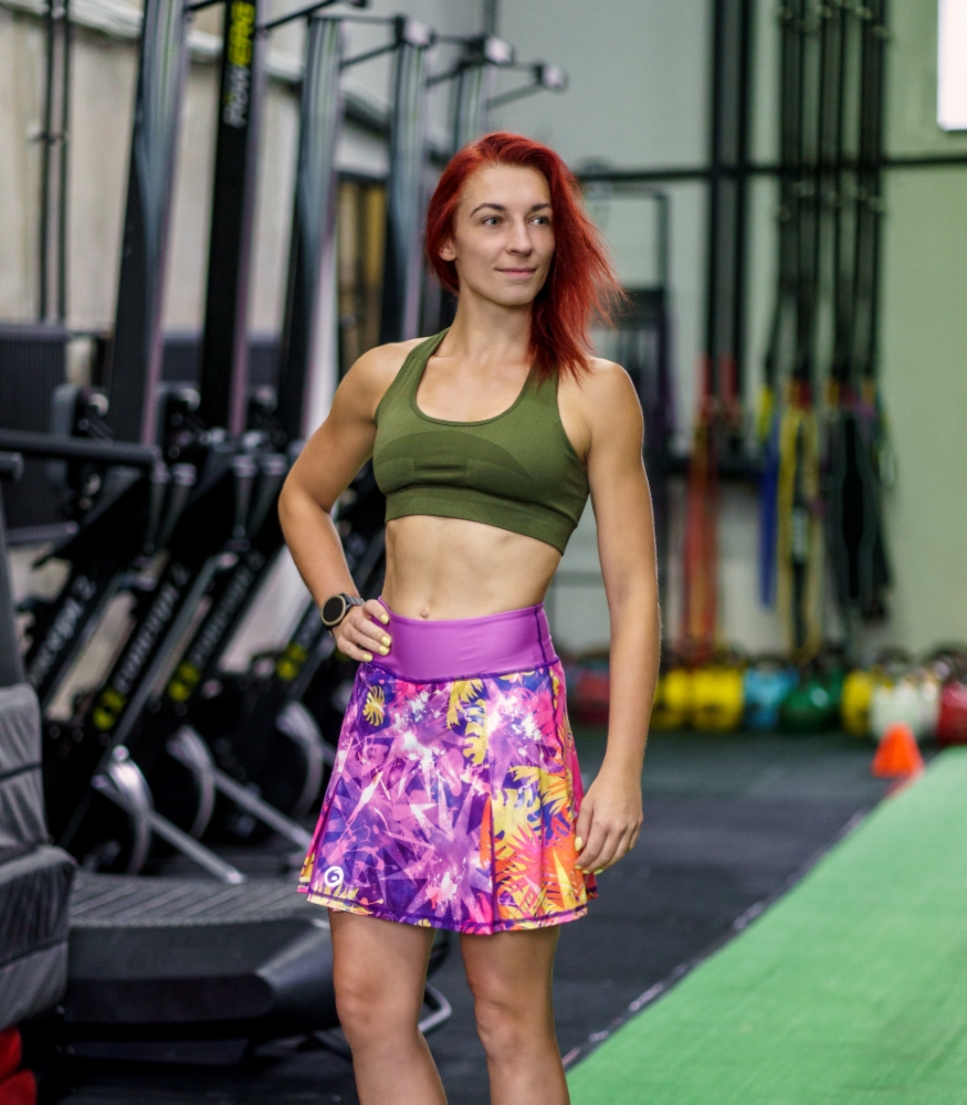 Krokodyl to sportowa spódniczka dla kobiet, które kochają kolory, ruch i oryginalny styl. Intensywne odcienie fioletu, różu, żółci i pomarańczowych tonów przenoszą Cię w sam środek energetycznych tropików – gdzie słońce grzeje mocniej, a endorfiny płyną szybciej. Ten wyrazisty wzór dodaje energii, motywuje do działania i sprawia, że każda aktywność staje się przyjemnością.