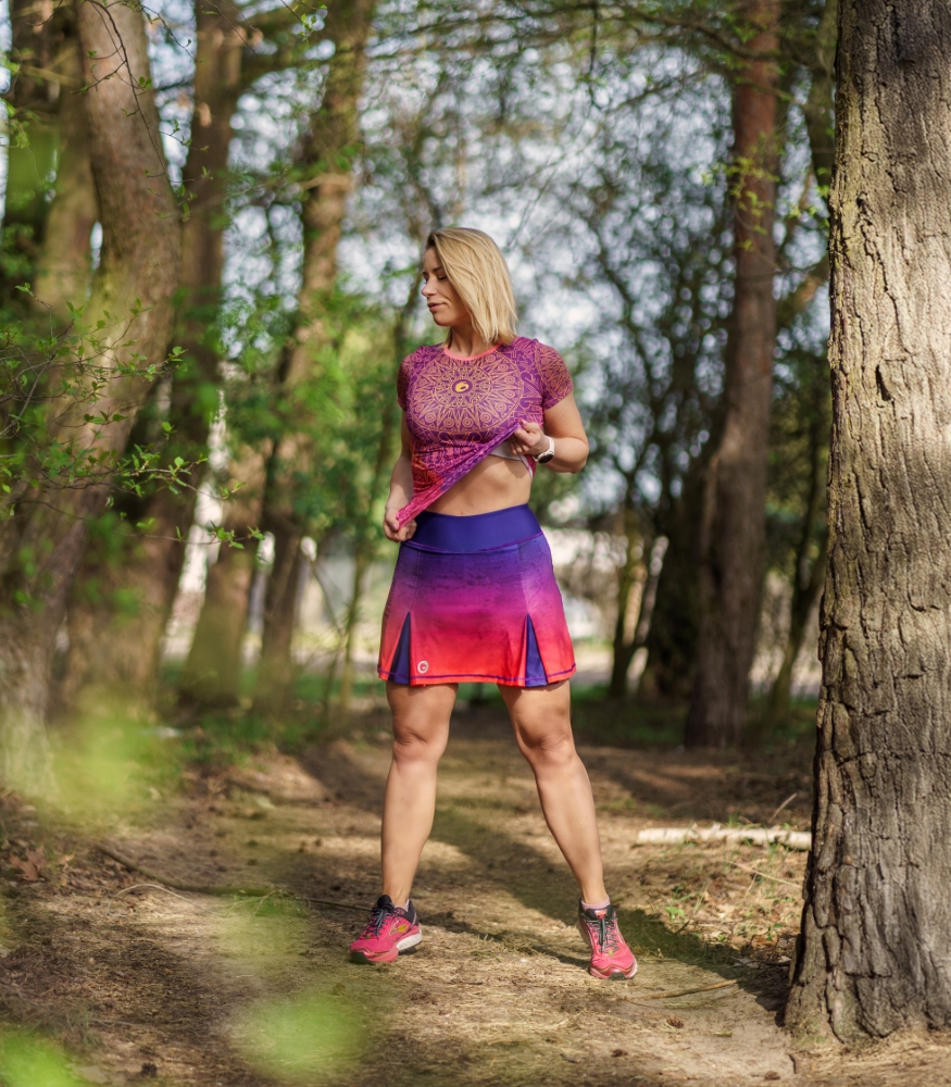 Idealna damska odzież sportowa istnieje! Spódniczka ze spodenkami sportowa Śliwka to tego najlepszy przykład. Zwiewna spódniczka w pięknym czerwono - fioletowym gradiencie skradnie Twoje serce i wyniesie każdy trening na wyższy poziom. To absolutny must-have dla każdej aktywnej kobiety!