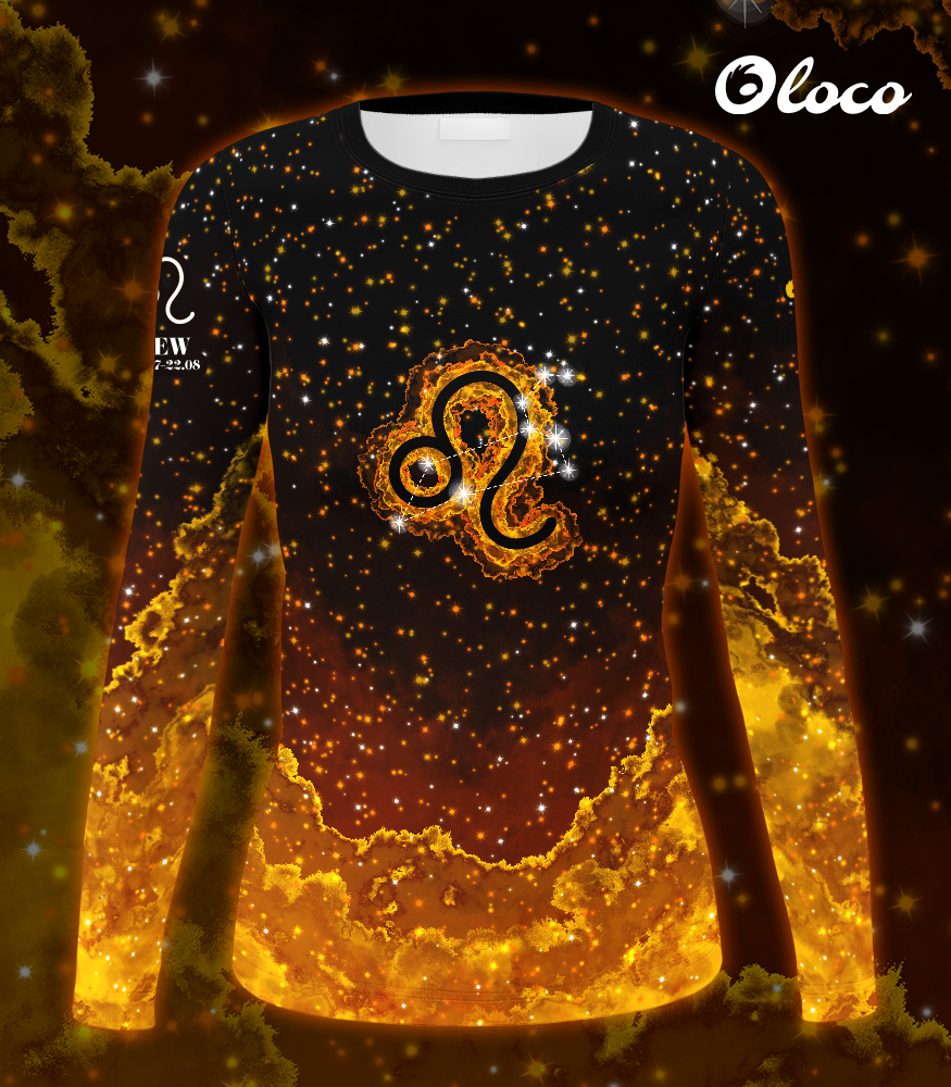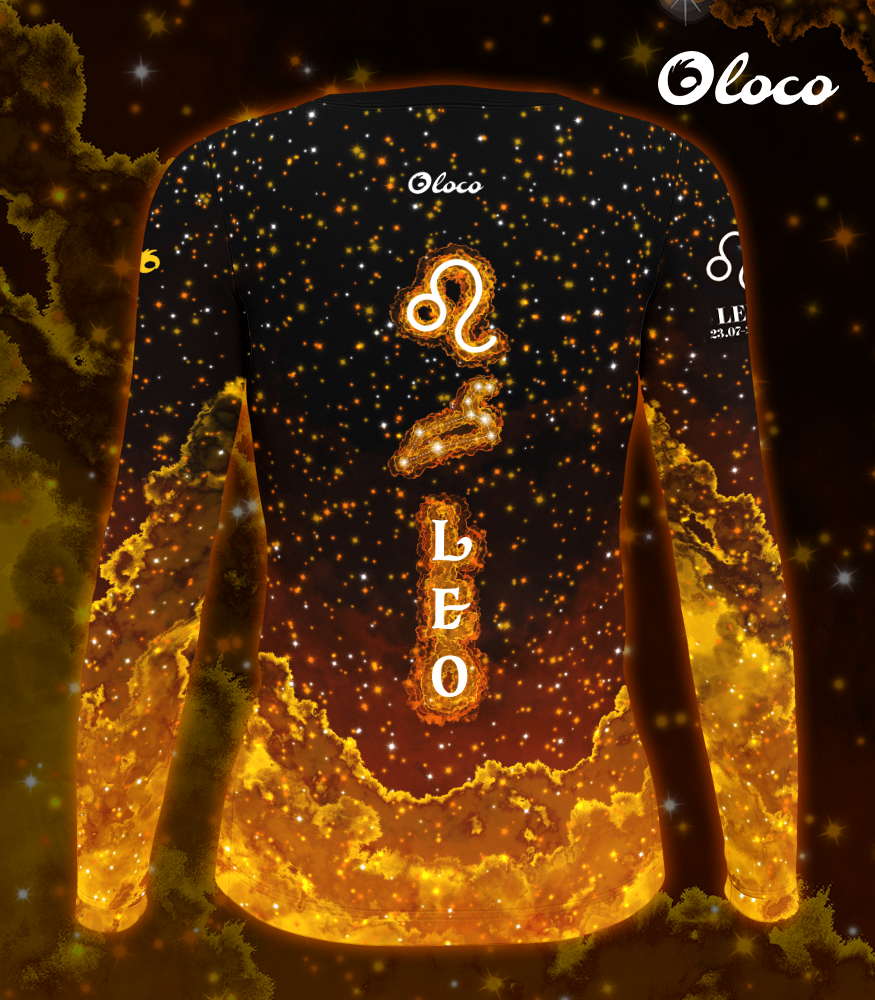Model Leo przyciąga wzrok intensywnym, dynamicznym wzorem inspirowanym gwiezdną energią ognistego Lwa. Na froncie widoczny jest astrologiczny symbol otoczony świetlistą poświatą przypominającą kosmiczną mgławicę. Dominujące barwy - złoto i pomarańcz - oddają pewność siebie, siłę, charyzmę i witalność typową dla tego znaku zodiaku. Złoto podkreśla królewski charakter i odwagę, a pomarańcz dodaje energii oraz kreatywnej iskry. Połączenie tych kolorów tworzy efektowny, mocny design, który wyróżni Cię zarówno na treningu, jak i w codziennych stylizacjach. Z tyłu znajduje się pionowa, łacińska nazwa znaku, dodająca całemu projektowi elegancji.