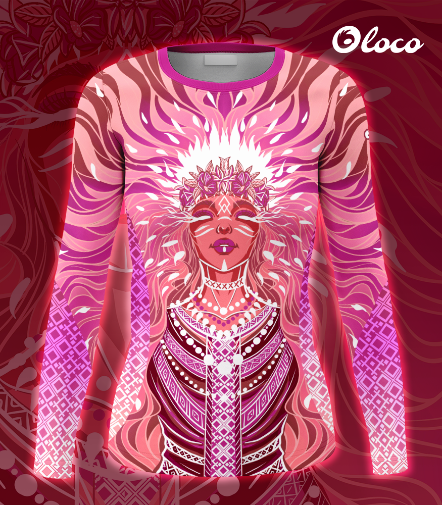 Longsleeve w kolorach fuksji i bordo. Oddychający materiał, ochrona UV i unikalny wzór bogini. Poczuj energię na każdym treningu!