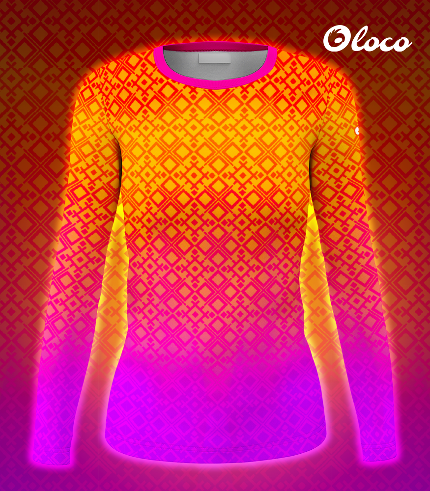 Longsleeve damski Summer to prawdziwa manifestacja pozytywnej energii. Wygląd produktu opiera się na intensywnym, płynnym gradiencie, który przypomina letni zachód słońca: góra koszulki tętni żółcią i pomarańczem, by u dołu przejść w głęboki róż i fiolet. Całość dopełnia nowoczesny, geometryczny wzór złożony z powtarzających się kwadratów i linii, który nadaje całości dynamicznego i bardzo modnego charakteru. Ten projekt nie tylko świetnie wygląda w ruchu, ale również dodaje pewności siebie, sprawiając, że będziesz wyróżniać się na każdej ścieżce biegowej czy szlaku.